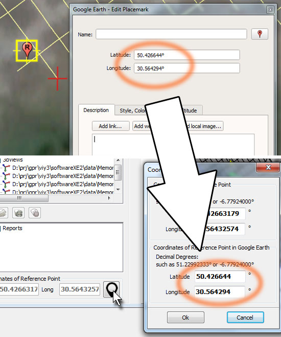 - in Google Earth, next to the reference point of the GPR project add Placemark and place it with the required shift