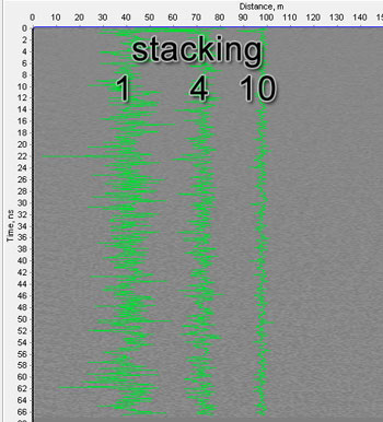 For pulse GPRs the most effective way to widen a dynamical range is 'stacking'. The increase of stacking number leads to an increase of signal/noise ratio but at the same time the increase of stacking number leads to the sounding speed decrease.