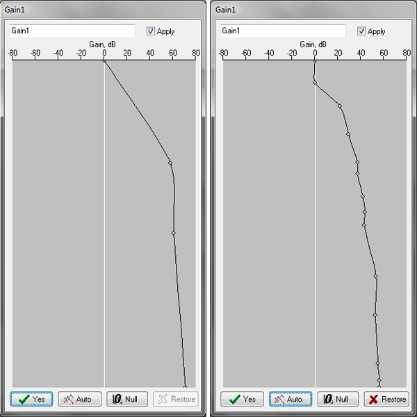 Right screenshot: gain curve was adjusted automatically (button Auto was pressed)